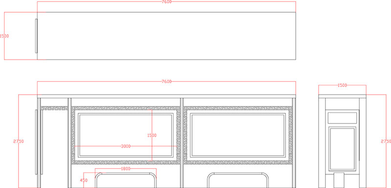 此款仿古候車亭CA-1056采用鍍鋅鋼結構,表面采用氟碳金屬烤漆工藝,視窗面板采用鋼化玻璃,燈箱內置LED燈。具有外形美觀、表面耐腐蝕、抗風性能強、使用壽命長等優點。產品的樣式、尺寸、顏色、材質、配置等均可按需定制。
